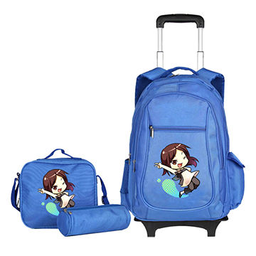 Model No锛3-pieces set children backpack with wheel, size: 45*36*24cm, custom cartoon printing |
